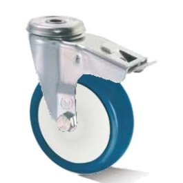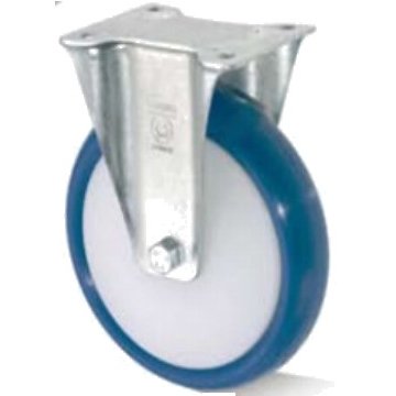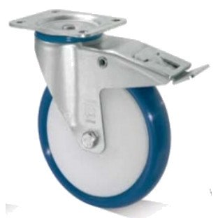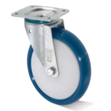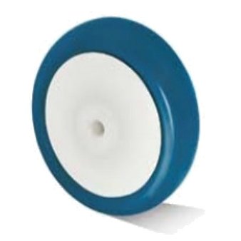 Колесо из отлитого под давлением синего полиуретанового контактного слоя и диска, выполненного из полиамида-6 белого цвета. Колесо оснащается шариковым подшипником непосредственно в процессе литья, тем самым неразъёмно соединяя его с основанием колеса; комплектуются нитезащитой Твёрдость 85 Shore A.